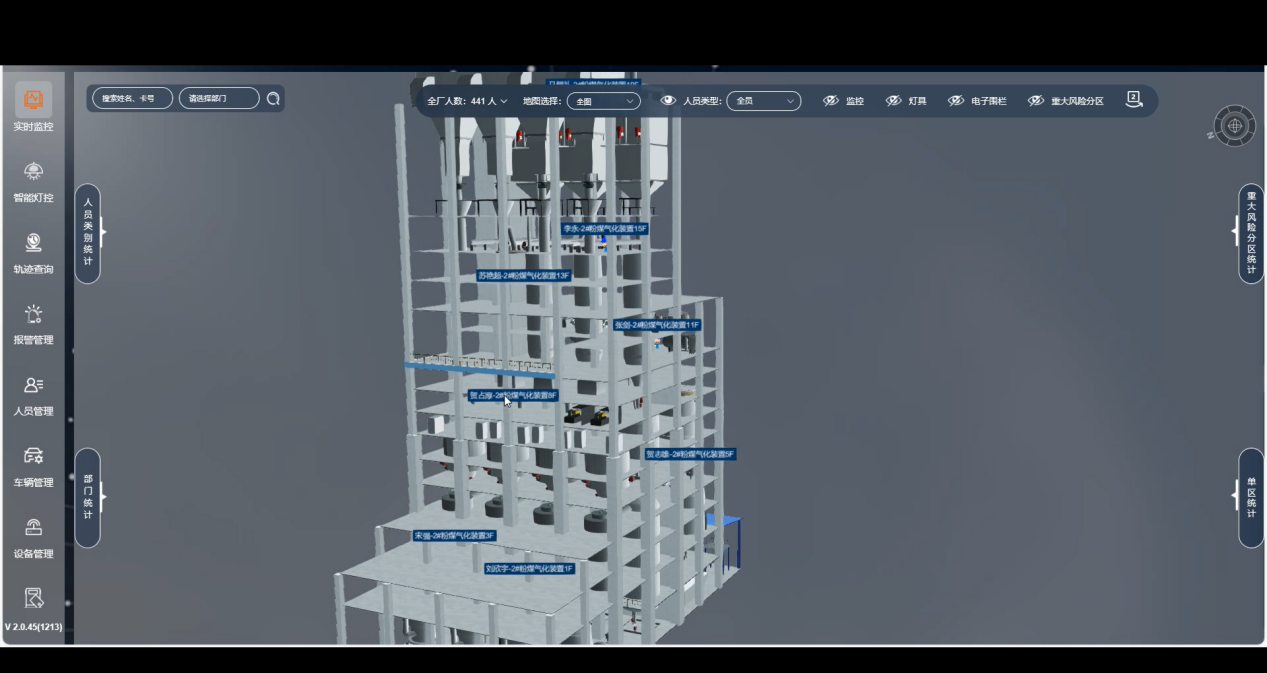 系統支持在工廠2D/3D電子地圖上實時顯示人員位置分布,可分樓層、分車間顯示;可對每個人的實時軌跡進行跟蹤,實現了對人員位置的實時追蹤和展示。