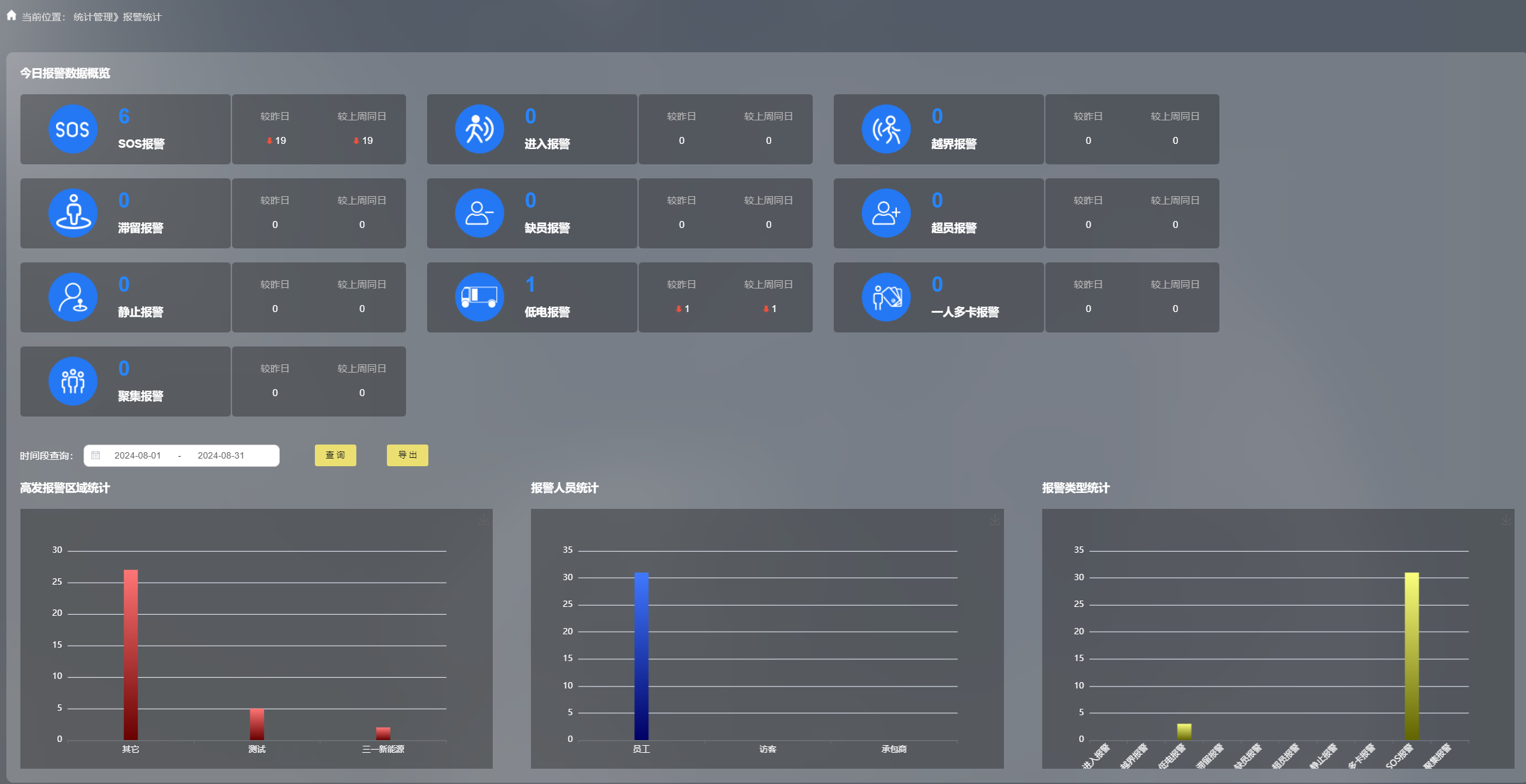 支持各類數(shù)據(jù)實(shí)時(shí)統(tǒng)計(jì)分析,提供全面的數(shù)據(jù)報(bào)表和可視化工具,以表格、熱力圖等形式展示各區(qū)域人員分布及報(bào)警信息等關(guān)鍵數(shù)據(jù)。