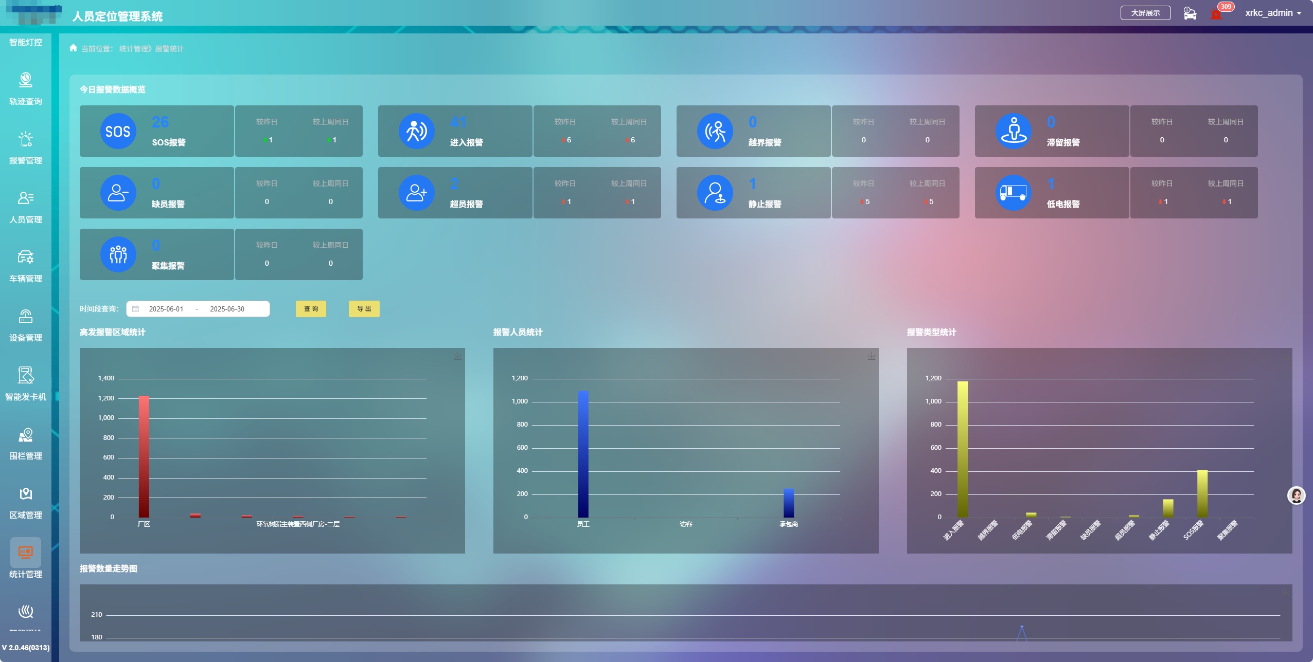 數據統計分析:支持各類數據的實時統計分析,提供全面的數據報表和可視化工具,以圖表形式展示各區域人員分布及報警信息等關鍵數據。